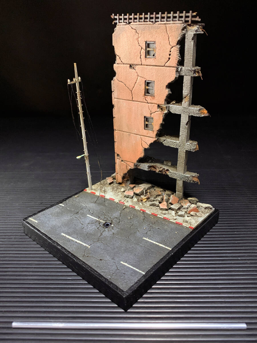 :ジオラマの大きさは台座を含めて105×105×145(横幅×奥行き×高さ。mm単位)程になります。 :使用した材料は、スチレンボード(複数種)、石膏、Nゲージ用品(複数種)、プラ材(複数種)、透明エポキシ樹脂、銅線、真鍮線、カタン糸、ジェッソ、ABSパイプ、木(複数種)などです。 :建物はスチレンボードとプラ材・銅線を組み合わせて制作。地面もスチレンボードから制作しています。 :窓枠を一つずつプラ棒で制作し、そこに割れたガラス(透明プラ板)を接着して廃墟感を演出しています。 :路面に散らばる割れたガラスを表現するため、細かく切り出した透明プラ板や、薄く伸ばして整形した透明エポキシ樹脂を砕いたものを蒔いています。 :路面の縁石は海外でたまに見かける紅白模様(国内にあるかは未確認)に塗装し、アクセントとしています。また道路標識の破線間隔も国内基準とは違い、幅が狭いものにしています。 :電柱や廃ビル屋上の柵はNゲージのものを使用。電線はカタン糸に接着剤を染み込ませてクセを作っています。 :彩色は全て水性塗料で塗装しています。また各部のウェザリングは油彩塗料を使用しています。 :台座は加工整形後に、アサヒペンの水性スーパーコート(つや消し黒)で仕上げています。 :塗装は全て、筆塗りによる手作業です。そのため多少のムラが生じる場合がございますが、味だと思っていただければ幸いです。 |