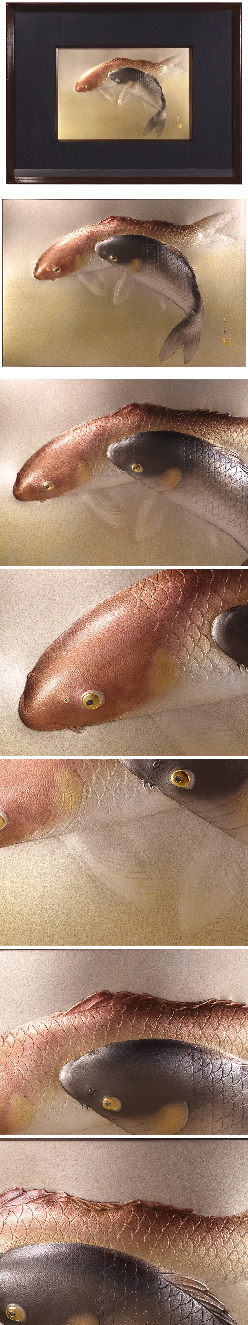 ∇花∇金工家【江幡雲林】作 高岡銅器 銅地金銀彩双鯉図彫金額 画面26×38cm 生命感あふれる夫婦鯉 收藏