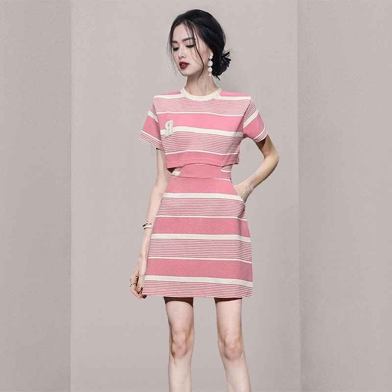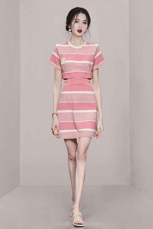 半袖ワンピース ミニワンピ 切り替え バイカラー スリム 着痩せ ボーダー柄 sweet系 S ピンク 收藏