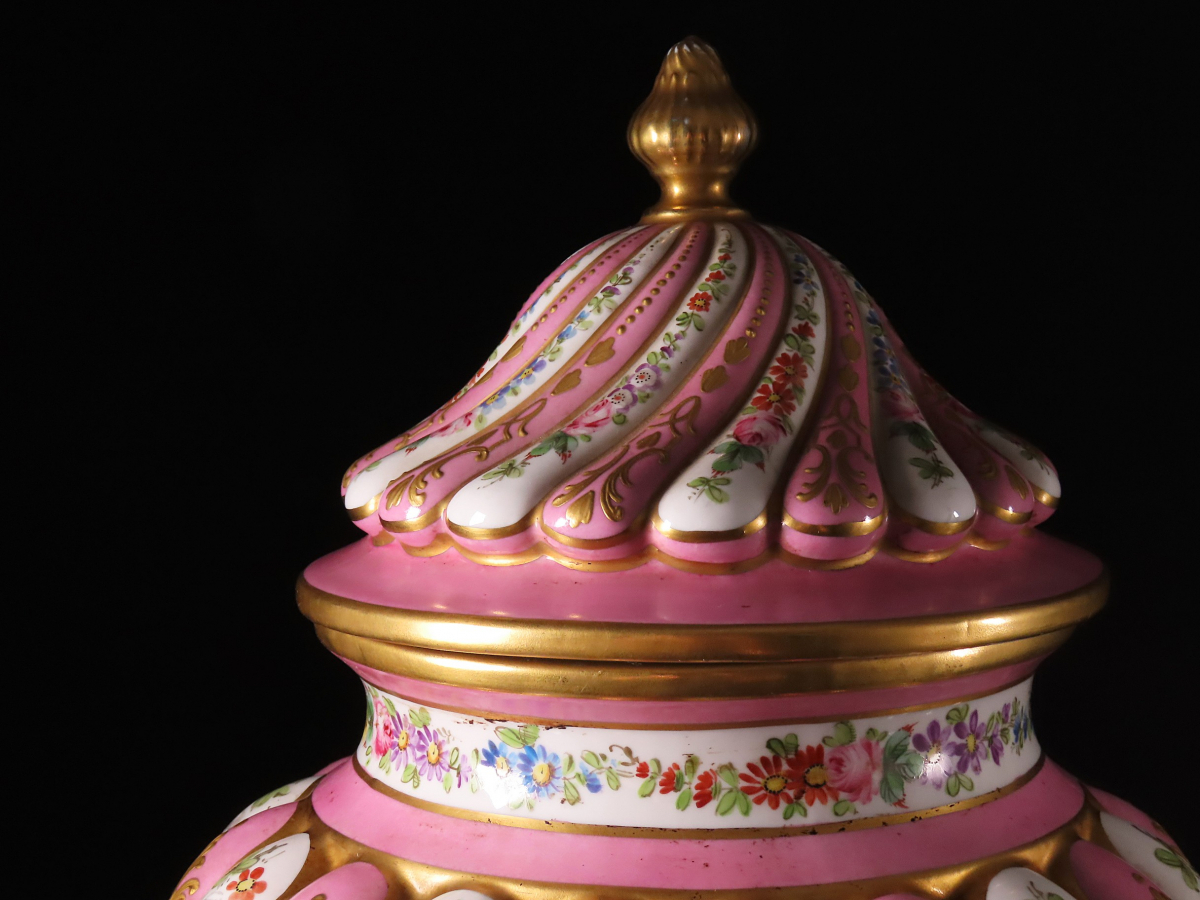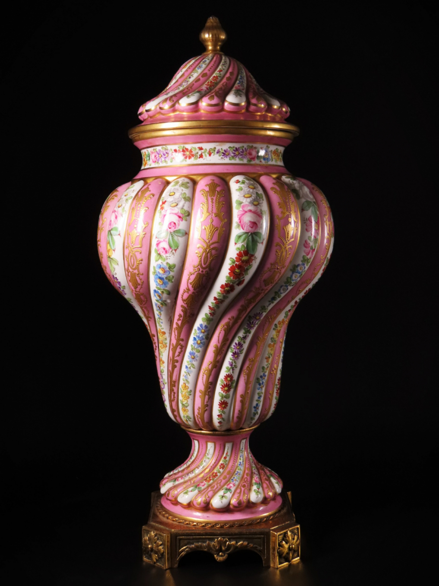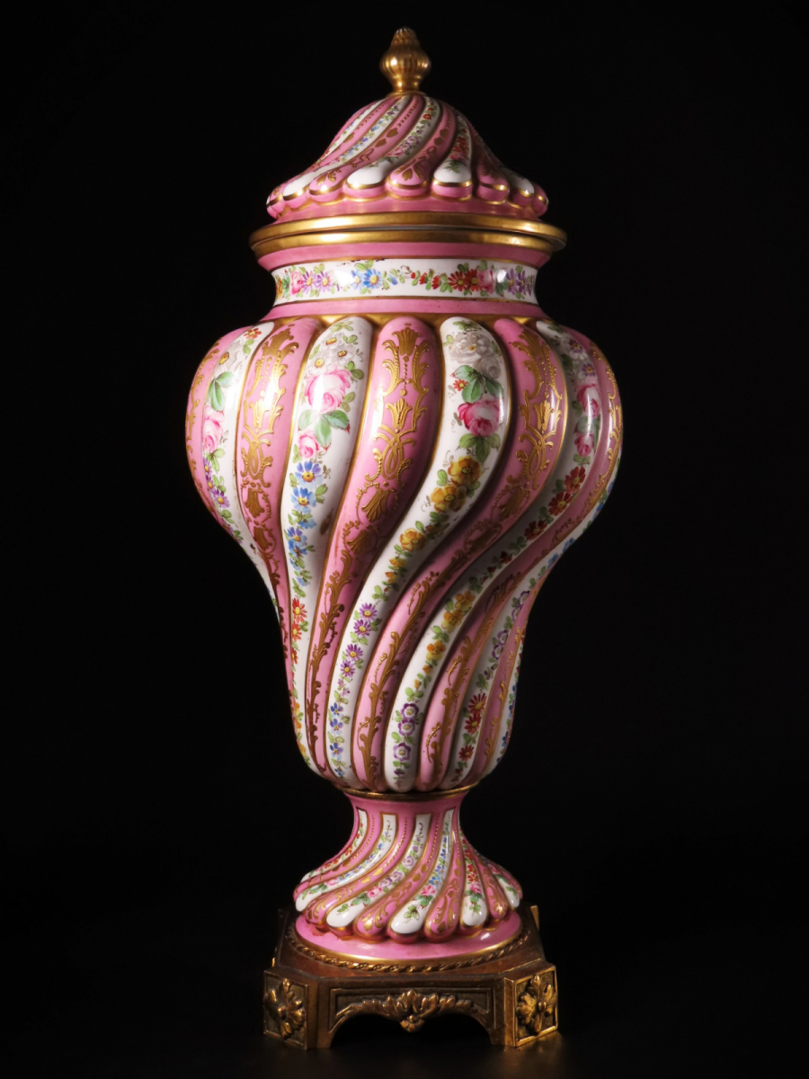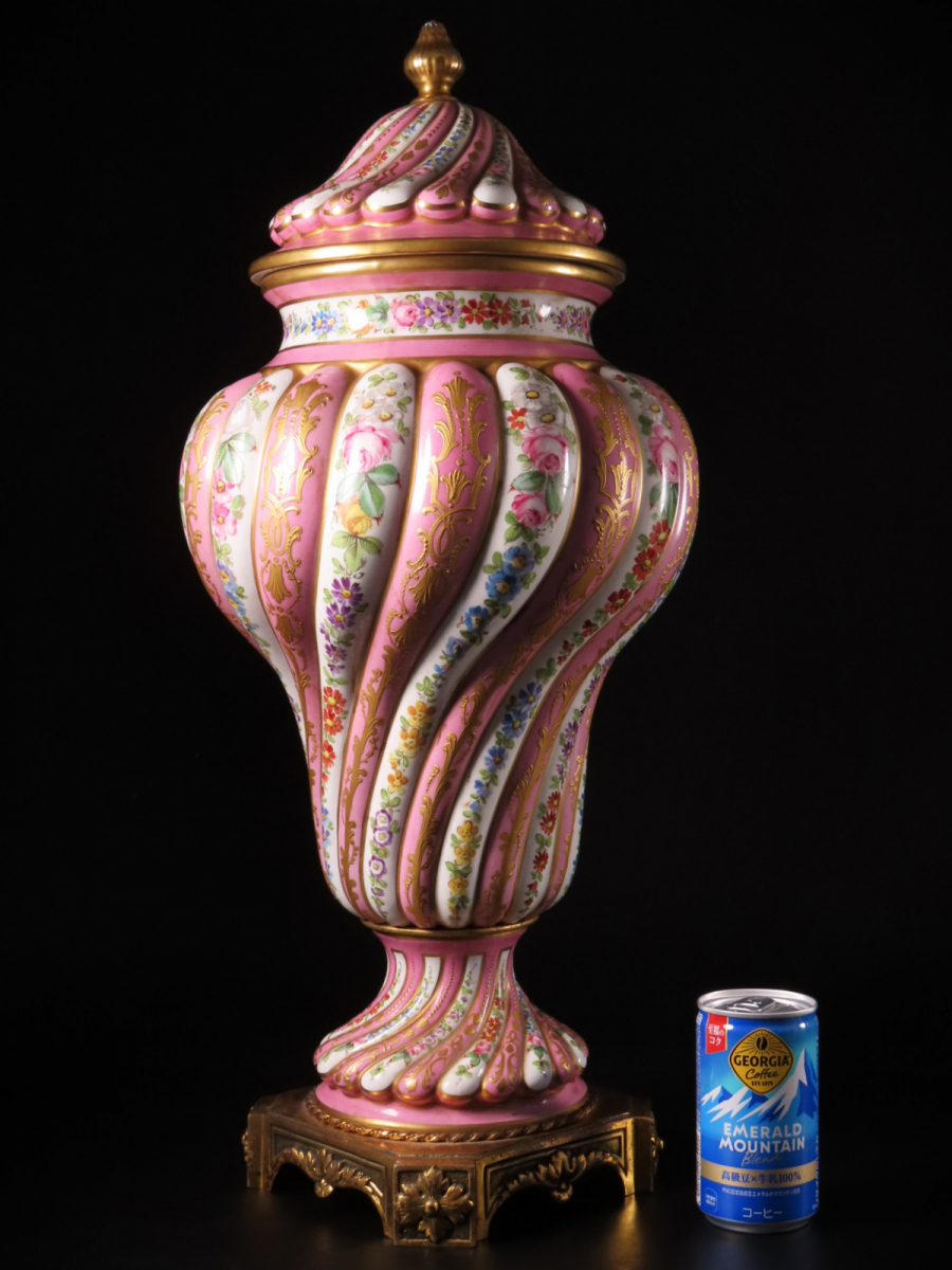 【ONE'S】19世紀 SEVRES セーブル パリ窯 ルイ15世様式 『ローズ・ポンパドール』 総手描 金彩蓋付飾壷 ブロンズ台座 高53.5cm 西洋美術 | |||