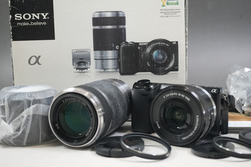 1円~【K611】SONY/ソニー α NEX-5T ブラック SELP1650(E3.5-5.6/PZ 16-50) SEL55210(E4.5-6.3/55-210) 元箱・フラッシュ(HVL-F7S)付