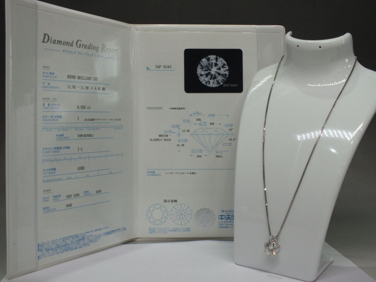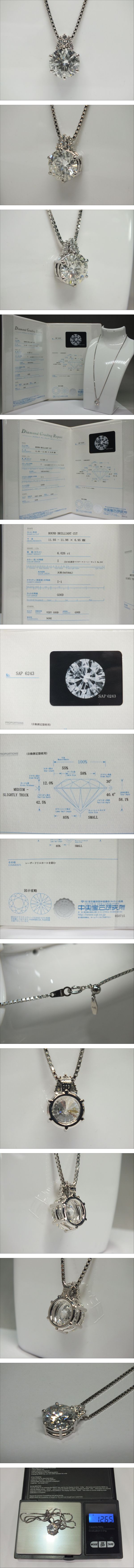 圧巻の6ctアップ ダイヤモンド ネックレス Pt850 トップPt900 中宝研 6.026ct I/I-1/GOOD/NONE メレダイヤ 0.19ct 收藏