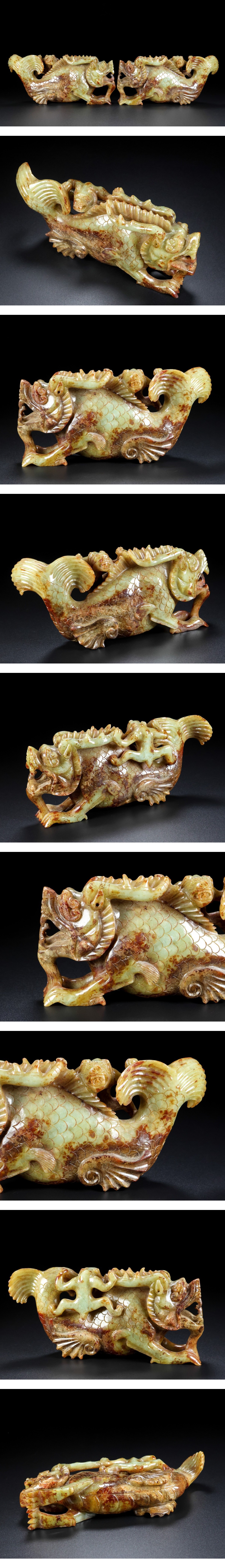 ◆珍蔵◆中国古美術 戰漢 高古玉 和田玉彫り龍頭魚―對 置物 擺件 古賞物 骨董品 時代物 A17 收藏