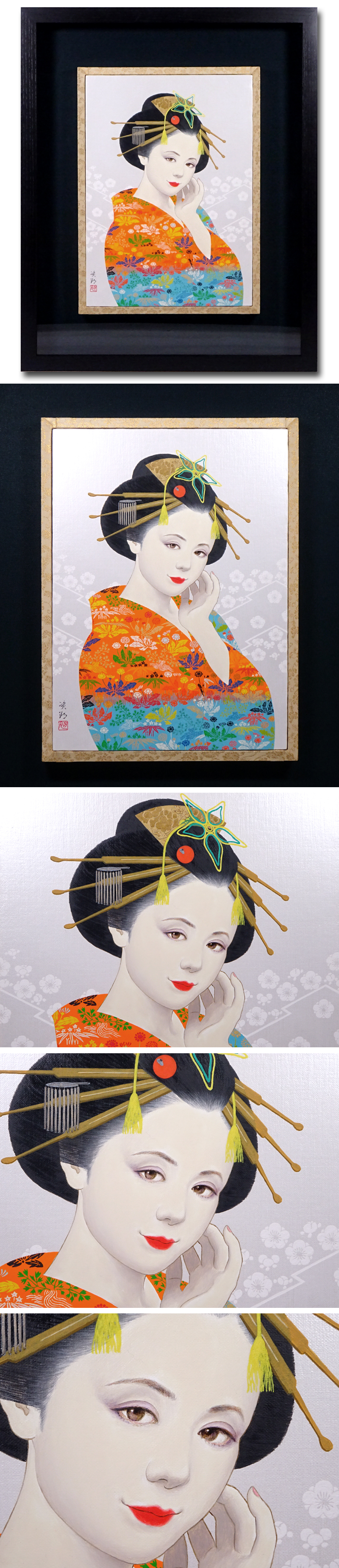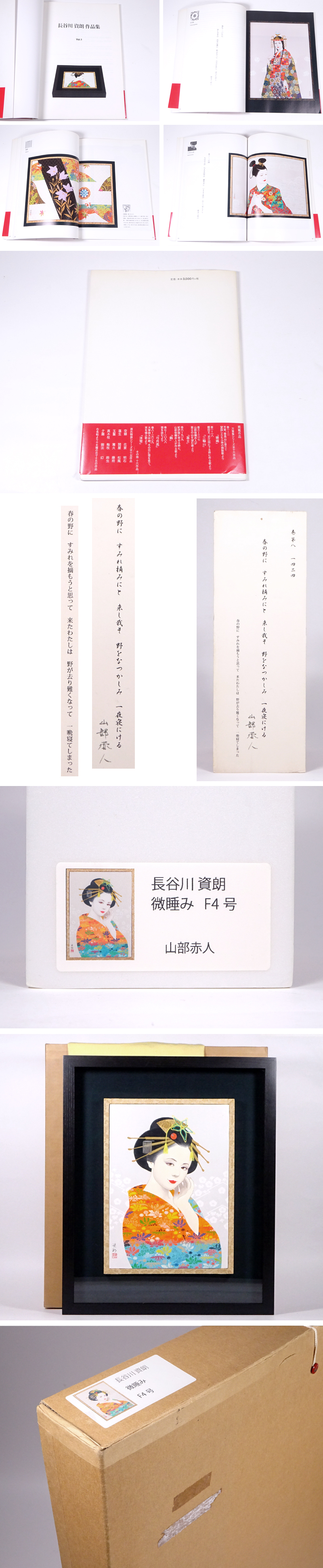 慶應◆【長谷川資朗】真筆 油彩F4号 万葉集・源氏物語シリーズ『微睡み』美人画 三十六歌仙の一人「山部赤人」の詠歌添 作品集付 收藏